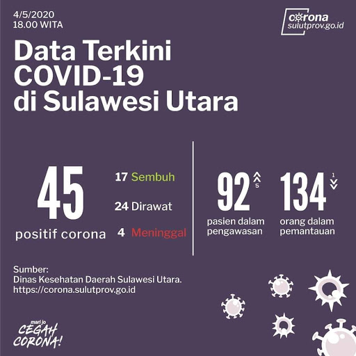 Jumlah pasien positif Covid – 19 di Sulawesi Utara sampai hari ini masih 45 orang. 24 orang diantaranya masih dirawat dibeberapa rumah sakit. Sedangkan jumlah pasien sembuh 17 orang dan meninggal 4 orang.