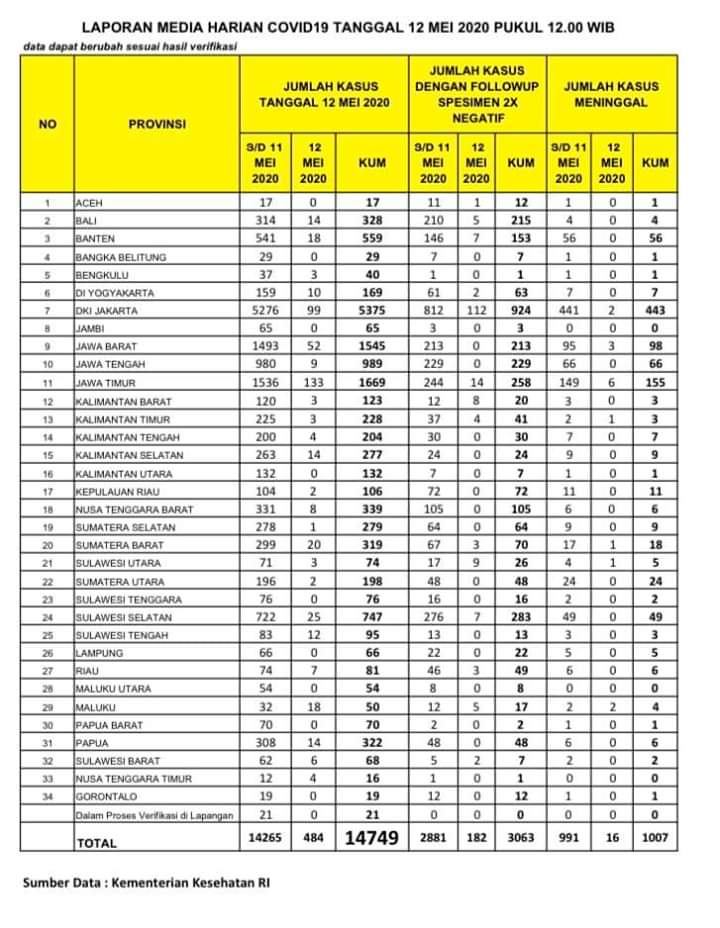 Exposenews.id, Manado – Kasus positif virus Corona (COVID-19) di Indonesia mencapai angka 14.749 hari ini. Jumlah pasien yang sembuh dari COVID-19 terus bertambah menjadi 3.603 orang. Sementara itu, jumlah pasien yang meninggal sebanyak 1.007 orang.