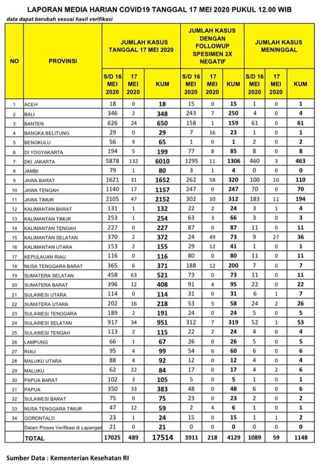 EXPOSENEWS.ID, Manado – Kementerian Kesehatan memperbarui data kasus virus Corona di wilayah Indonesia. Per hari ini, tercatat ada 17.514 kasus positif virus Corona di Tanah Air.