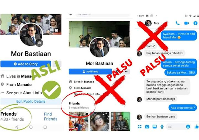 Modus penipuan ini tak mengenal siapa Anda, baik pejabat maupun masyarakat biasa pun bisa “dimanfaatkan” untuk menipu kenalan Anda. Salah satu tokoh pejabat yang berusaha disamakan akun facebooknya untuk menipu orang lain ialah Wakil Wali Kota (Wawali) Manado, Mor Bastiaan.