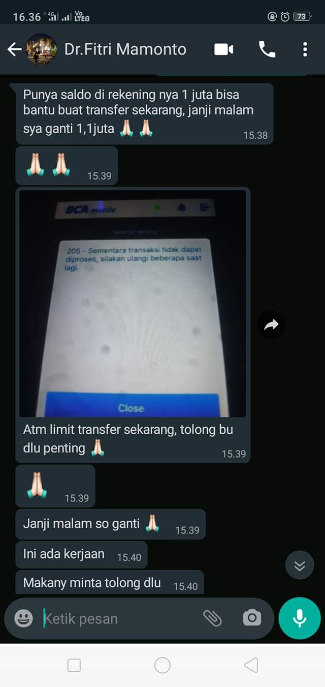 “Punya saldo di rekening nya 1 juta bisa bantu buat transfer sekarang, janji nanti malam sya ganti 1,1 juta,” tulis oknum penipu yang mengatasnamakan Fitri Mamonto.