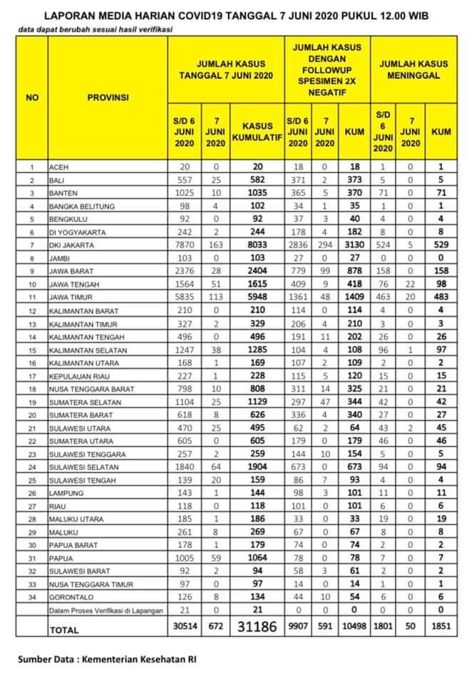 Di sisi lain, jumlah kasus positif di Indonesia hari ini bertambah 672 menjadi 31.186.