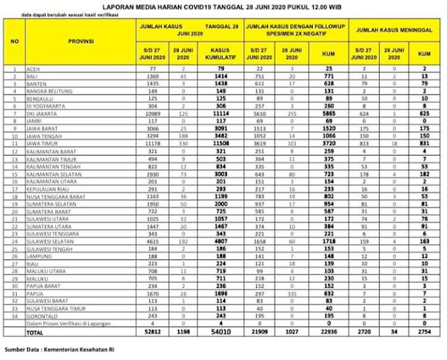 Exposenews.id, Manado – Kementerian Kesehatan memperbarui kasus positif covid di Indonesia. Pada Minggu (28/6) hari ini, Jumlah kasus positif di Indonesia bertambah 1.198 menjadi 54.010.
