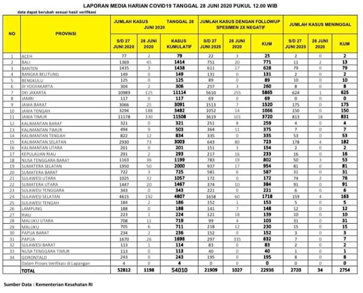 Exposenews.id, Manado – Kementerian Kesehatan memperbarui kasus positif covid di Indonesia. Pada Minggu (28/6) hari ini, Jumlah kasus positif di Indonesia bertambah 1.198 menjadi 54.010.