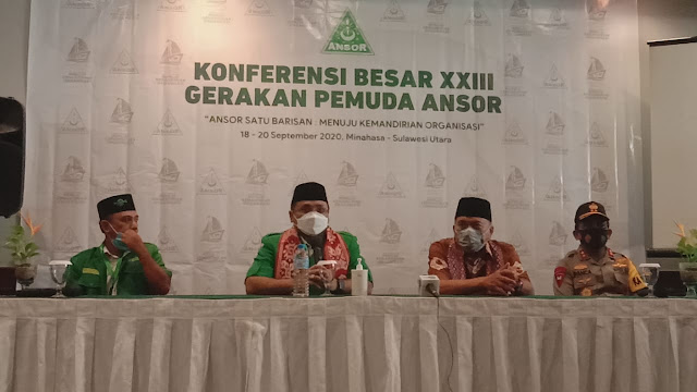 Exposenews.id, Tateli – Konferensi Besar ke-23 Gerakan Pemuda Ansor se-Indonesia dilaksanakan di Kabupaten Minahasa, Sulawesi utara pada 18 hingga 20 September 2020. Konferensi yang sempat tertunda akibat pandemi virus covid-19 tersebut akhirnya terselenggara dengan dibuka langsung oleh Presiden Joko Widodo secara virtual.
