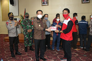 Fatoni juga menyerahkan masker secara simbolis kepada para buruh sebagai bentuk kepedulian pemerintah dalam memutus mata rantai penyebaran Covid-19 di kalangan buruh. (RTG)