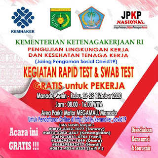 Exposenews.id, Manado – Menindaklanjuti surat Direktur Jenderal Pembinaan Pengawasan Ketenagakerjaan dan Keselamatan Kerja (K3) Nomor 5/360/AS.04.01/X/2020 tanggal 21 Oktober 2020 Perihal Rekruitmen Peserta dalam Pelaksanaan Rapid Test, maka Dinas Tenaga Kerja dan Transmigrasi Sulawesi Utara bakal mengadakan rapid dan swab test bagi pekerja di Sulut.