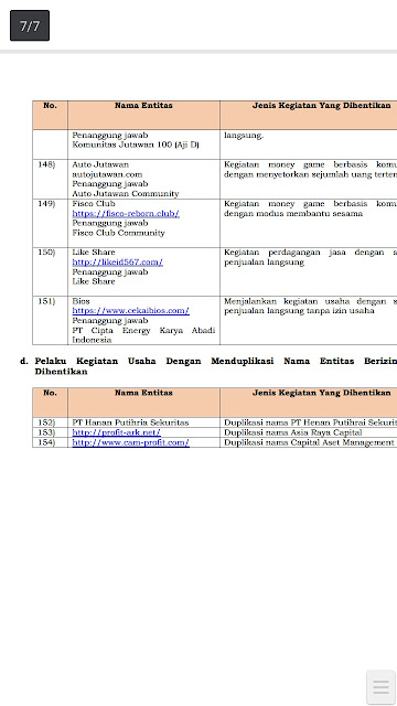 Satgas sejak tahun 2018 hingga Oktober 2020 telah menghentikan sebanyak 2923 fintech lending ilegal. Sementara 154 entitas yang menawarkan investasi ilegal terdiri dari :