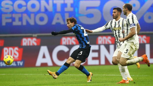 Gol! Barella mencetak gol kedua Inter ke gawang Juventus. Pemain Italia itu berdiri bebas menerima umpan jauh Alessandro Bastoni dan meneruskannya menjadi gol. Nerazzurri menjauh 2-0.