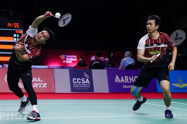 Exposenews.id, Bangkok – Hendra Setiawan/Mohammad Ahsan terhenti di semifinal Toyota Thailand Open 2021. Mereka ditaklukkan Wang Chi-Lin/Lee Yang 21-14, 20-22, dan 12-21.