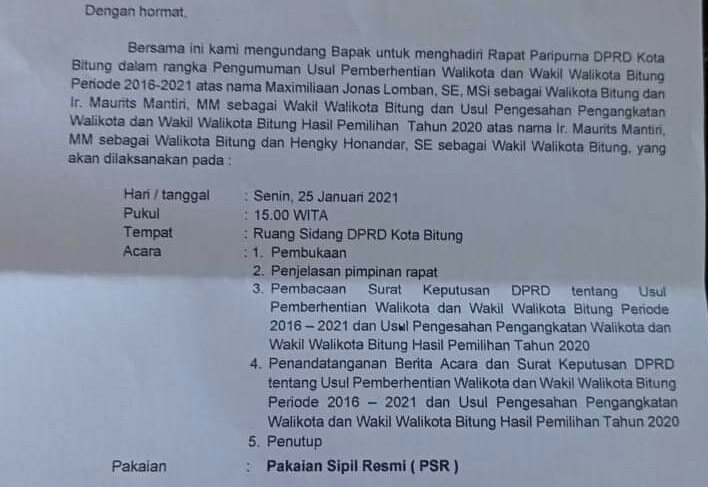 Informasi tersebut berdasarkan Surat Undangan Resmi dengan Nomor 005/DPRD/29/I/2021 tertanggal 23 Januari 2021, yang ditujukan kepada paslon terpilih. Surat tersebut diupload di grup media sosial facebook.