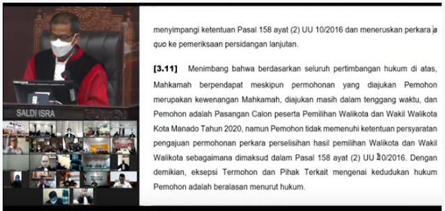 Sidang dimulai pukul 10.47 WIB itu digelar lewat daring dan dihadiri semua yang berkepentingan yakni pemohon, pihak terkait kuasa hukum paslon nomor urut 1, Andrei Angouw dan Richard Sualang (AARS), KPU dan Bawaslu Kota Manado.