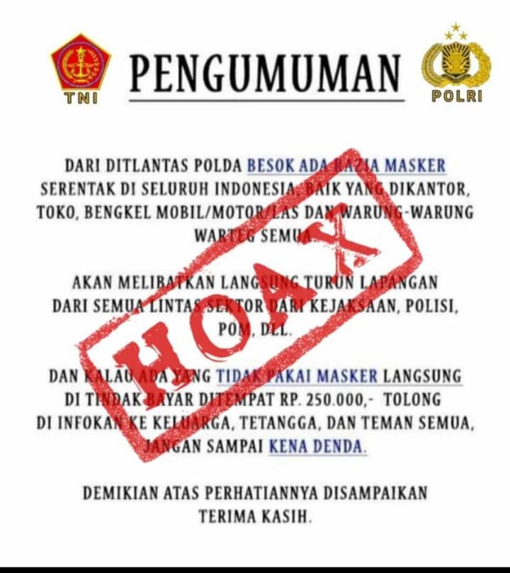 Exposenews.id, Jakarta – Viral Sebuah pesan berantai menyebutkan adanya razia masker dari jajaran Ditlantas Polda se-Indonesia. Tertulis dalam pesan itu pelanggar akan didenda Rp250.000.