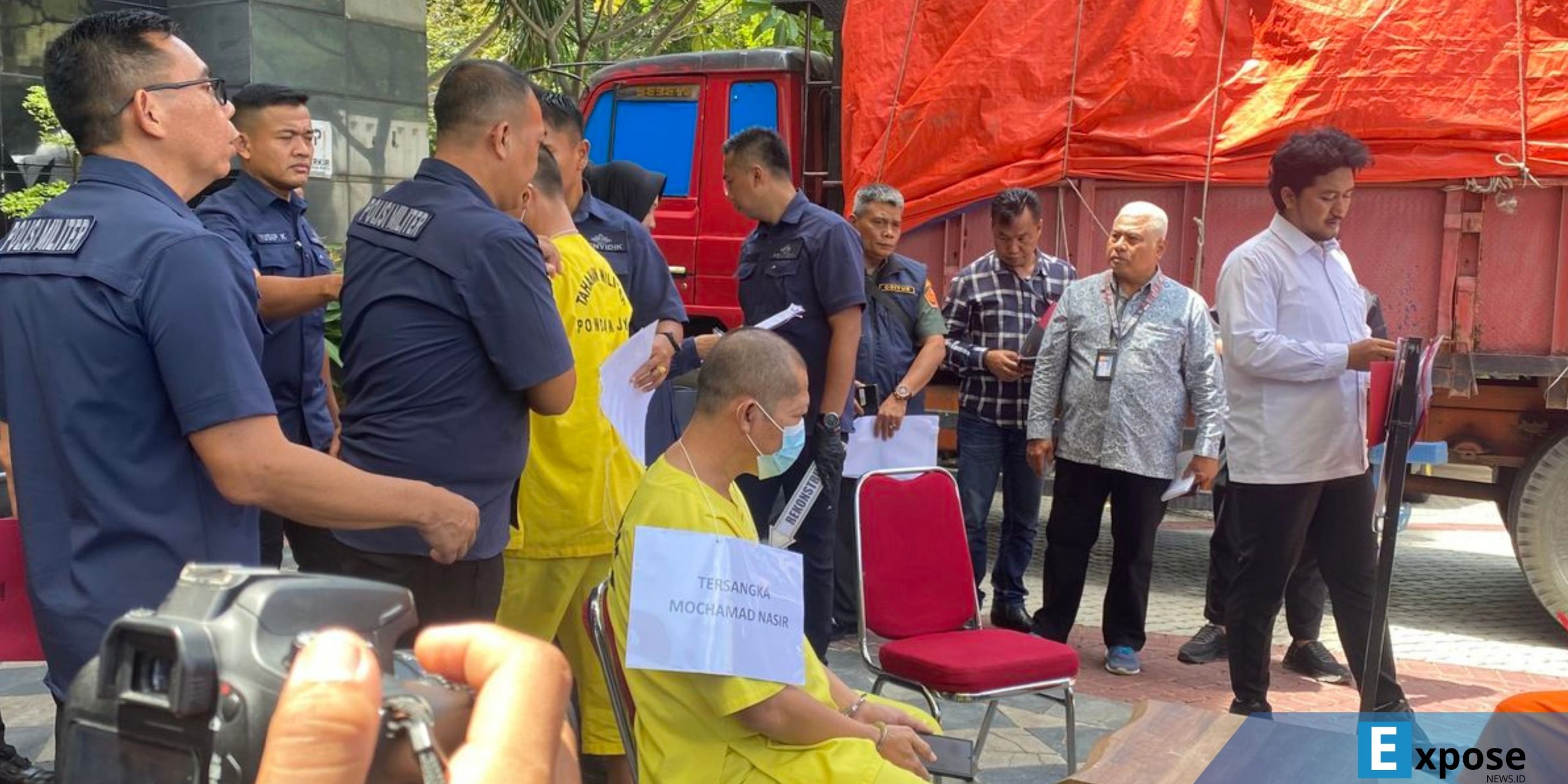 Tampak jelas, 15 di antaranya mengenakan seragam oranye khas dengan tulisan “Tahanan Polda Metro Jaya” dan tangan mereka diikat menggunakan kabel ties. Sementara itu, dua tersangka lainnya justru mengenakan baju kuning yang mencolok dengan tulisan “Tahanan Militer Pomdam Jaya” di bagian punggungnya.